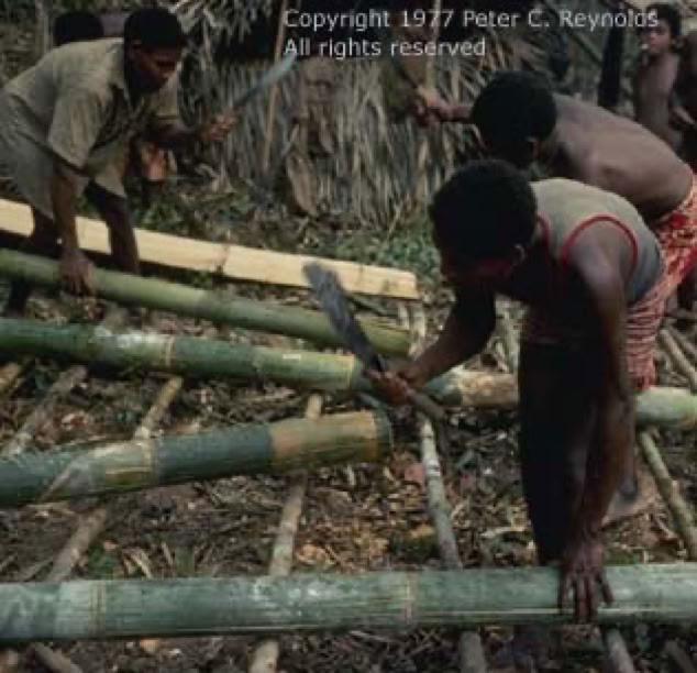 In the photo above, some men cut bamboo poles to the same length and split them, while others tie them in place. These are Batek, a hunting and gathering people on the Malay Peninsula.