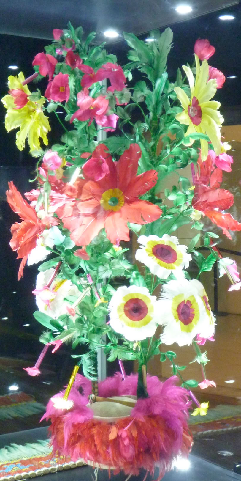 Andean cultures use feathers as an artistic medium with religious significance. In ritual, flowers represent the food provided by that plant, such as the white flowers above which represent potato plants. To dance in a feathered hat is to give thanks, invoke plant fertility,